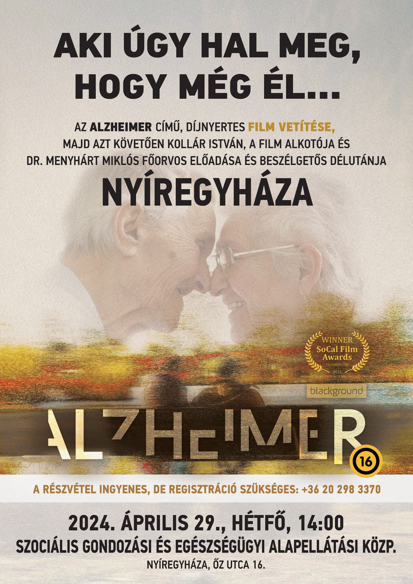 2024. április 29. (hétfő) 14:00 órakor, az ALZHEIMER című díjnyertes filmet tekinthetik meg az érdeklődők az Őz utca 16. szám alatti Nappali Ellátó Központban.