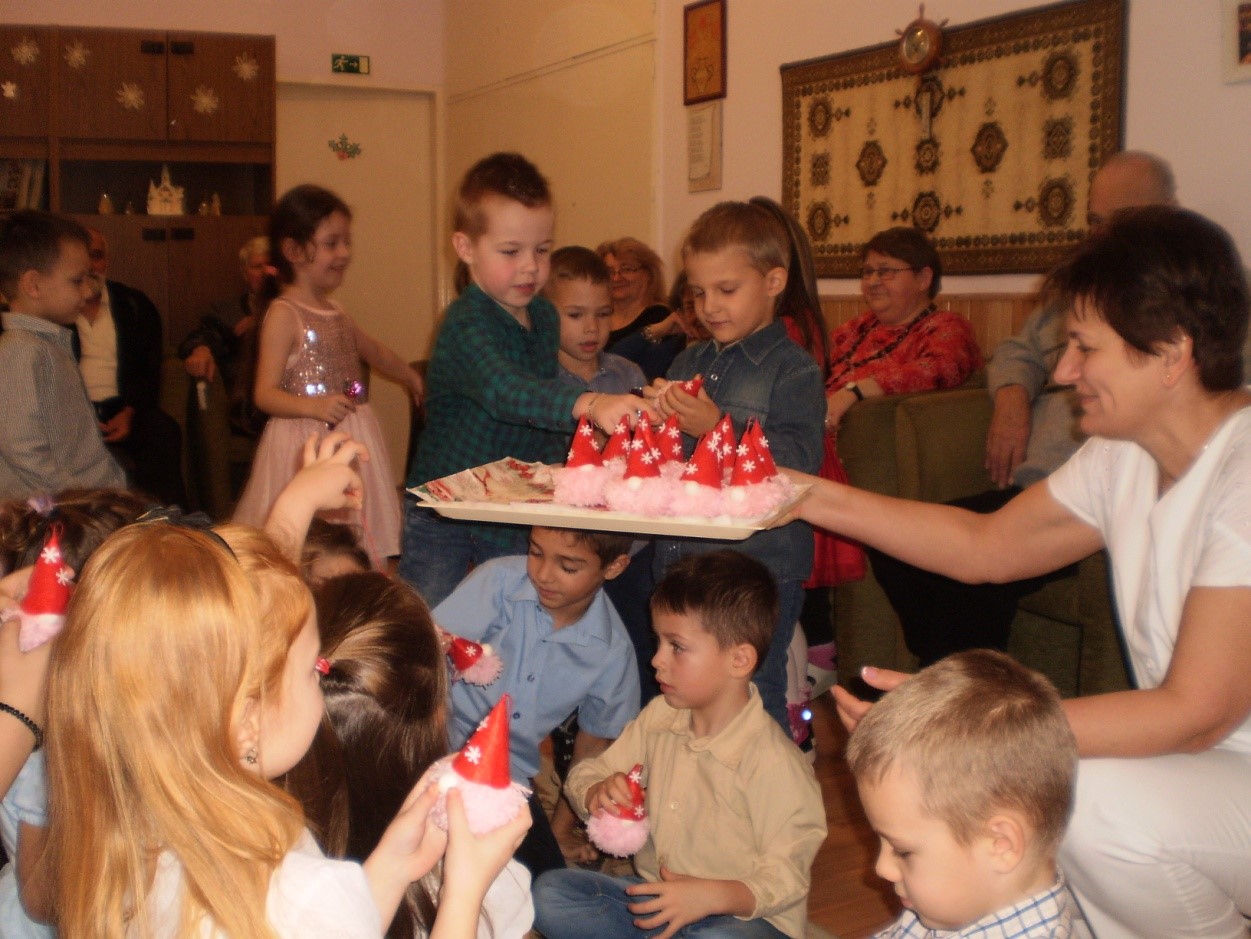 A szeretetteljes műsor után a közös sütizés, igen oldottá tette a hangulatot, majd az izgalmas ajándékozás következett. A nyugdíjasok saját készítésű karácsonyi manóval lepték meg az óvodásokat. Köszönjük az együtt töltött időt!